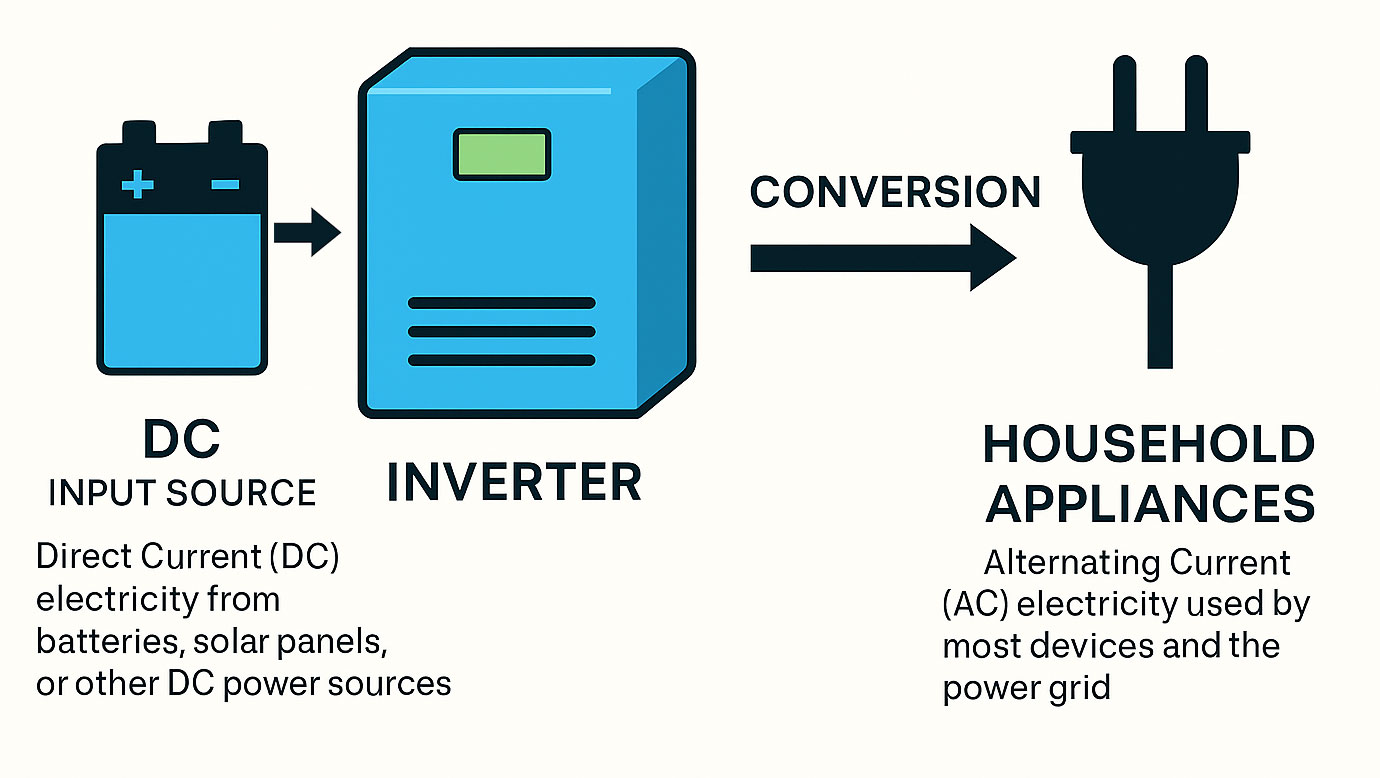An inverter is an electronic device that converts direct current (DC) electricity into alternating current (AC) electricity. It’s essential for enabling DC power sources like solar panels, batteries, or fuel cells to run AC-powered devices such as household appliances, industrial equipment, or grid-tied systems.